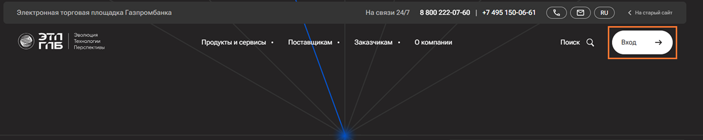 На главной странице в правом верхнем углу нажмите кнопку «Вход» и затем выберите нужную вам секцию торгов.