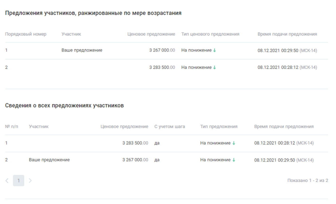 В форме подачи ценовых предложений отображаются предложения всех участников аукциона — они ранжируются по мере возрастания. Лучшим считается предложение с минимальной ценой. Этот участник побеждает в закупке.