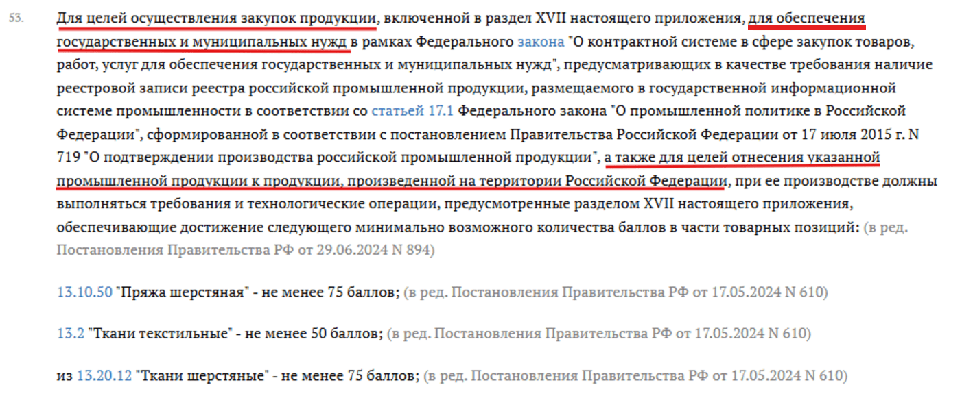 Совокупное количество баллов может быть единым для нескольких целей. Например, для закупок и отнесения продукции к российской. Как правило, тогда эти цели включены в один абзац.
