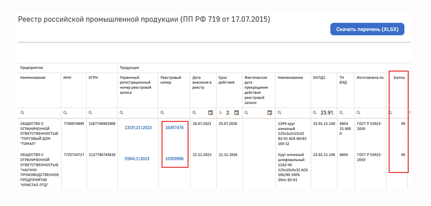 Совокупное количество баллов, начисленных продукции, указано в РРПП и выписке из реестра. Среди найденных записей нужно оставить только записи с необходимым количеством баллов. В нашем примере это продукция с 35 и более баллами.