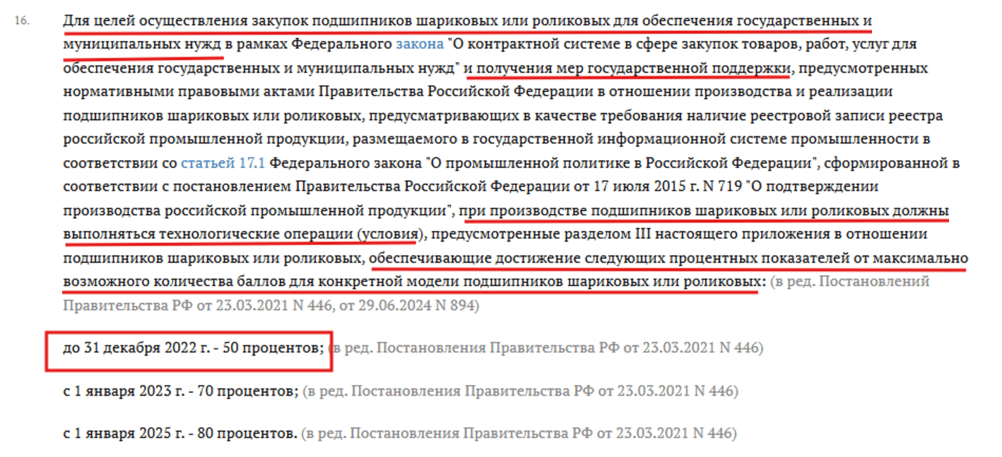 Помимо количества баллов, для отдельных товарных групп предусмотрены долевые критерии — процент баллов от максимально возможного значения. Так, для шариковых и роликовых подшипников (код 28.15.10, раздел III Приложения к ПП РФ 719) с 1 января 2025 установлено требование в 80% от максимума.