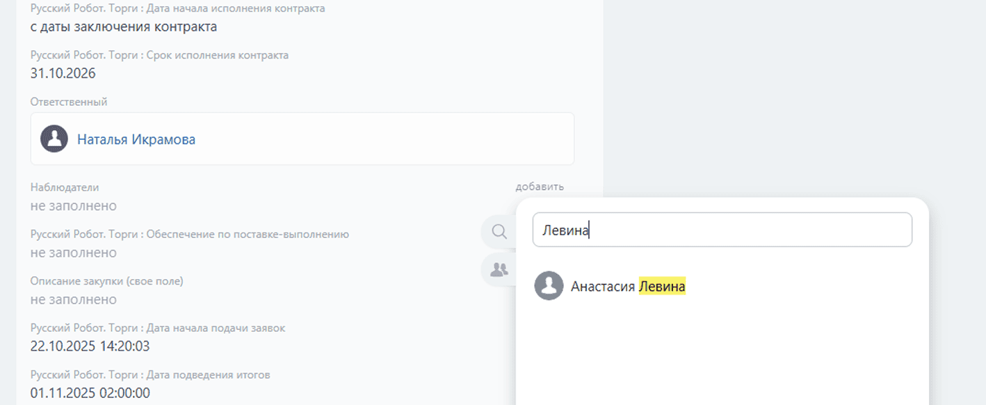 - Обмениваться информацией о тендерах и участии в них со смежными отделами, ставить задачи и добавлять наблюдателей.