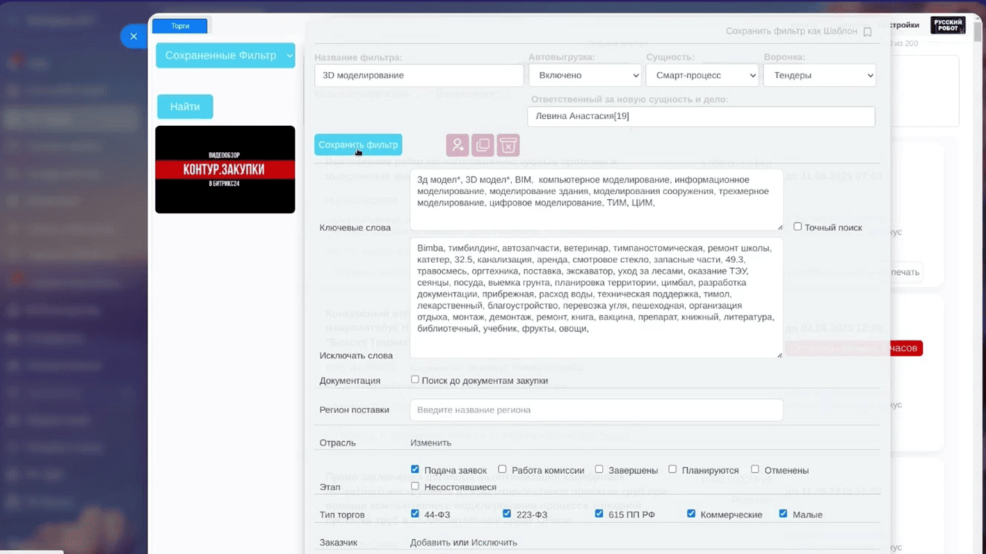- Распределять тендеры, выбирать ответственного за фильтр при автовыгрузке.