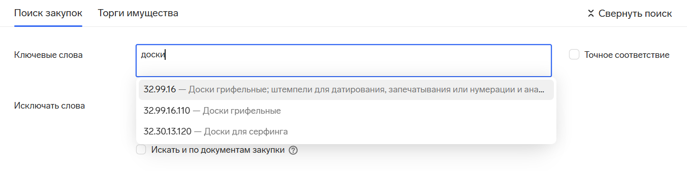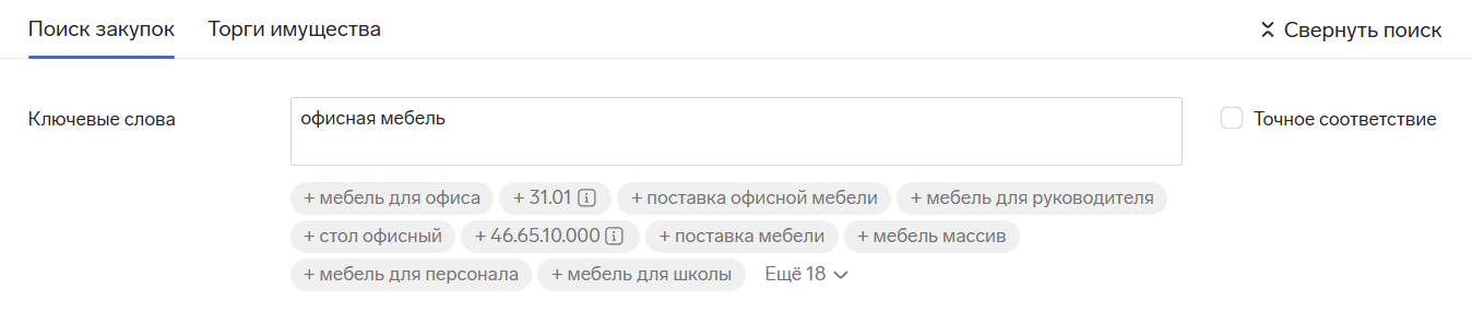 Для упрощения подбора закупок усовершенствовали и строку поиска. Теперь сервис подсказывает ключевые слова и тем самым помогает составить более полный запрос.