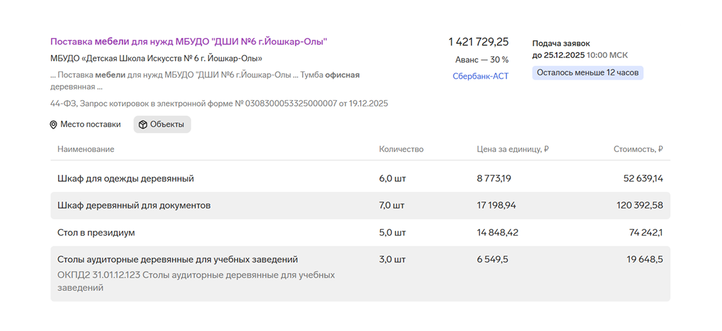 Больше информации в карточках закупки