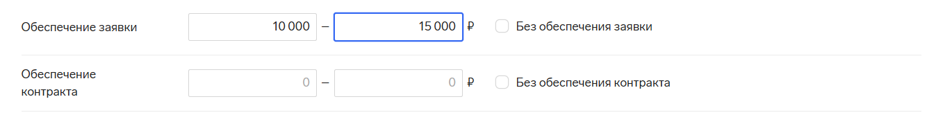 Добавили два новых фильтра: «Обеспечение заявки» и «Обеспечение контракта». Они работают по одному принципу. При поиске закупок можно задать диапазон обеспечения или искать тендеры без установленных обеспечительных мер.