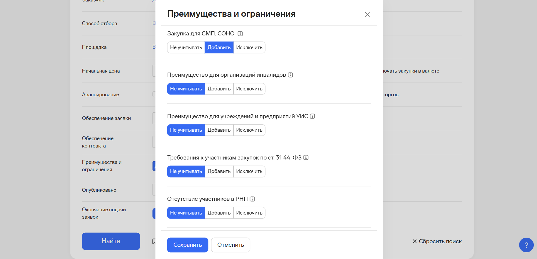 Во всплывающем окне фильтра можно выбрать, какие требования, преимущества и ограничения учитывать при поиске, а закупки с какими параметрами исключить из выдачи.