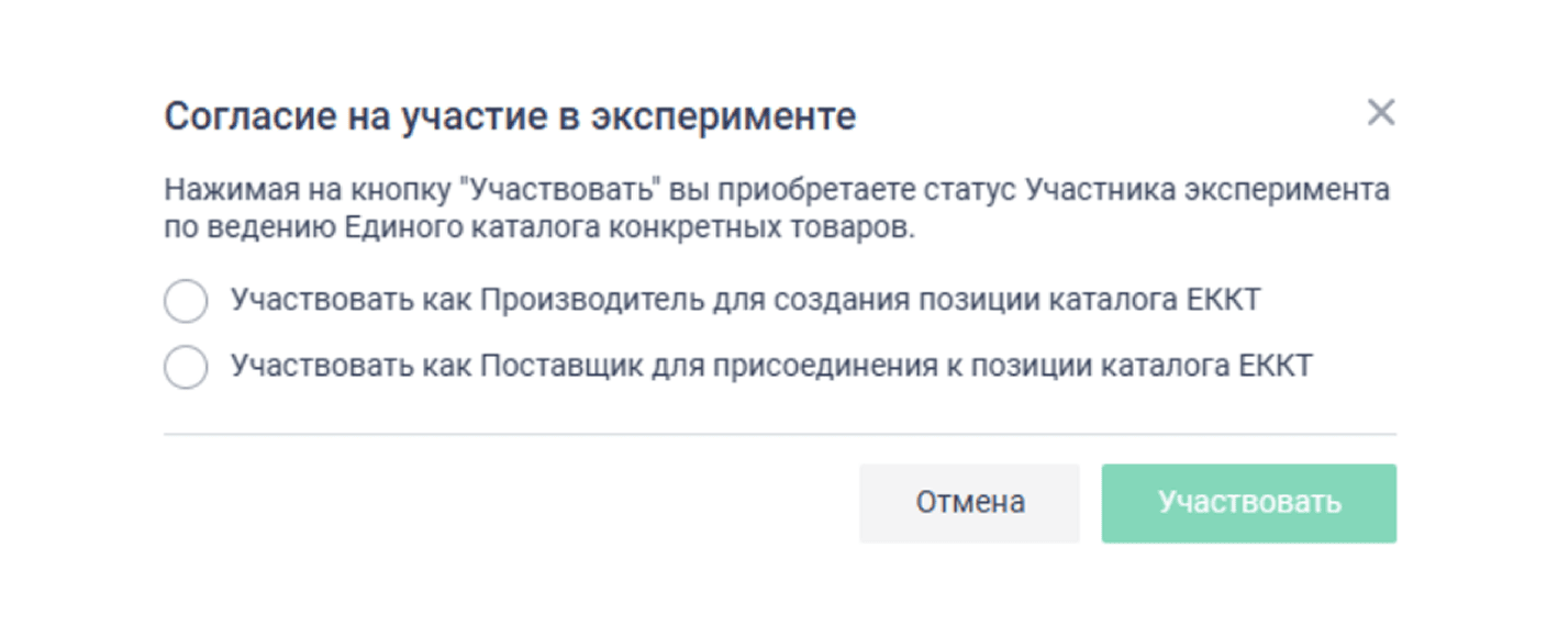 После авторизации необходимо присоединиться к эксперименту. Для этого перейдите в соответствующий раздел портала и выберите роль: производитель или поставщик.